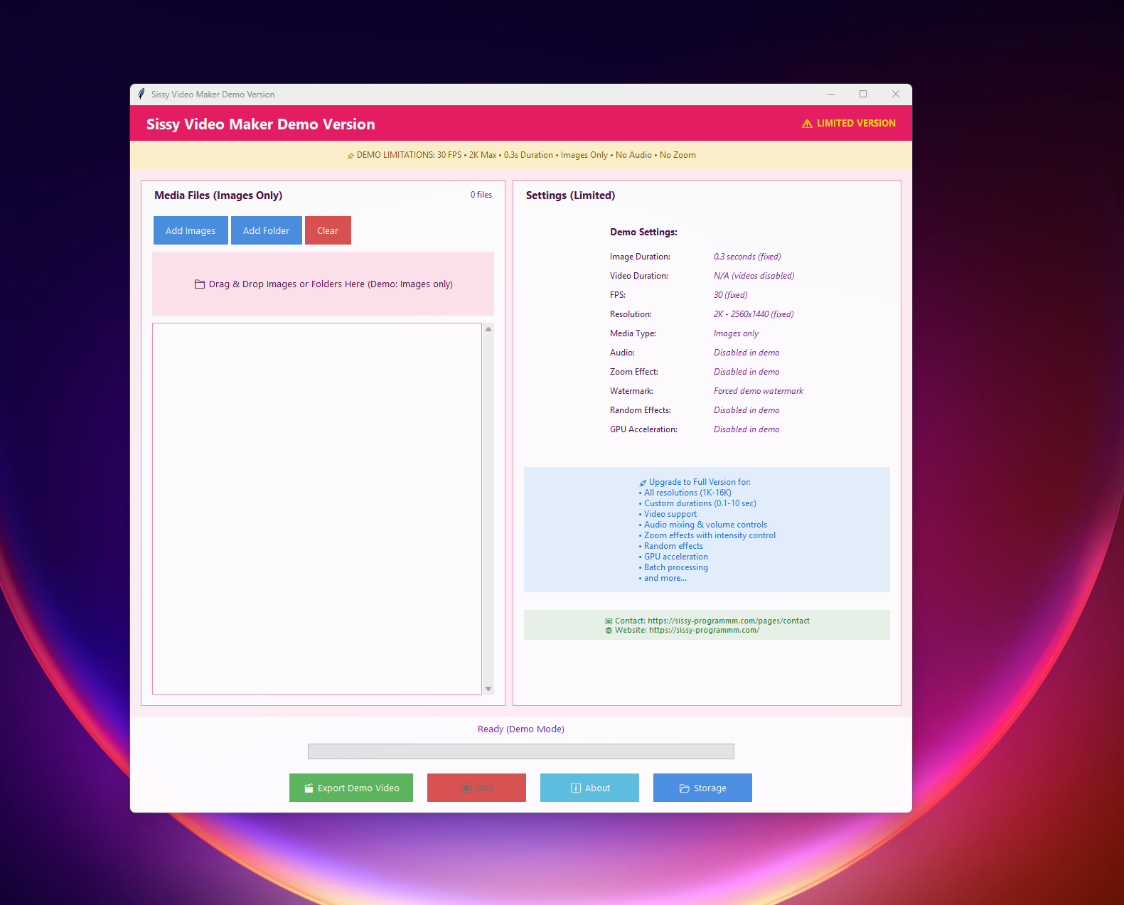 Demo (short): Try Sissy Video Maker with a simplified, image-only Demo (2K/30fps, fixed durations, watermark). Upgrade for videos, audio mixing and looping, random image durations, zoom effects, and more.
